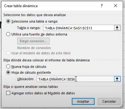 Después, desde la pestaña Insertar hacemos clic en el botón Tabla Dinámica (Insertar > Tabla dinámica). Aparece esta ventana emergente: