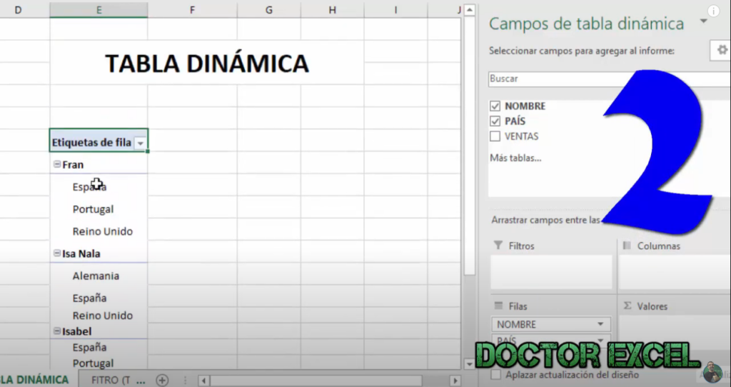 Arrastramos los campos Nombre y País a la zona filas.