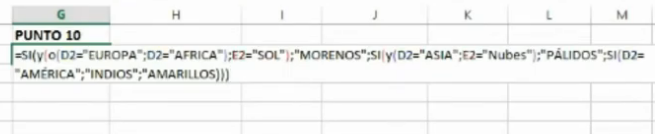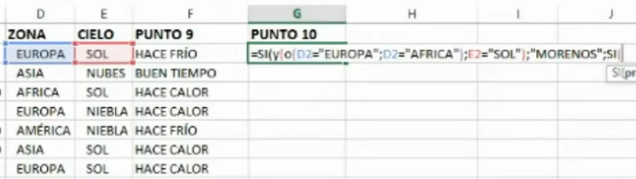 =SI(Y(O(D2=”EUROPA”;D2=”AFRICA”);E2=”SOL”); “MORENOS”